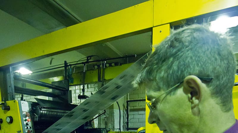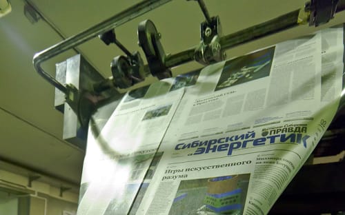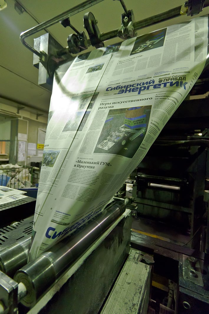 Многотонные машины печатают газеты со скоростью десять тысяч экземпляров в час. Человеческий глаз не успевает следить за всеми процессами. Рядом со станками лежат большие рулоны бумаги, каждый весом 400 килограммов. Похоже это на гигантские мотки ниток. На столах – ёмкости с жёлтой, красной, синей и чёрной красками. Их, словно масло на хлеб, рабочие намазывают на валы в печатных машинах. И уже сама техника растягивает краску толщиной в сотые доли миллиметра.