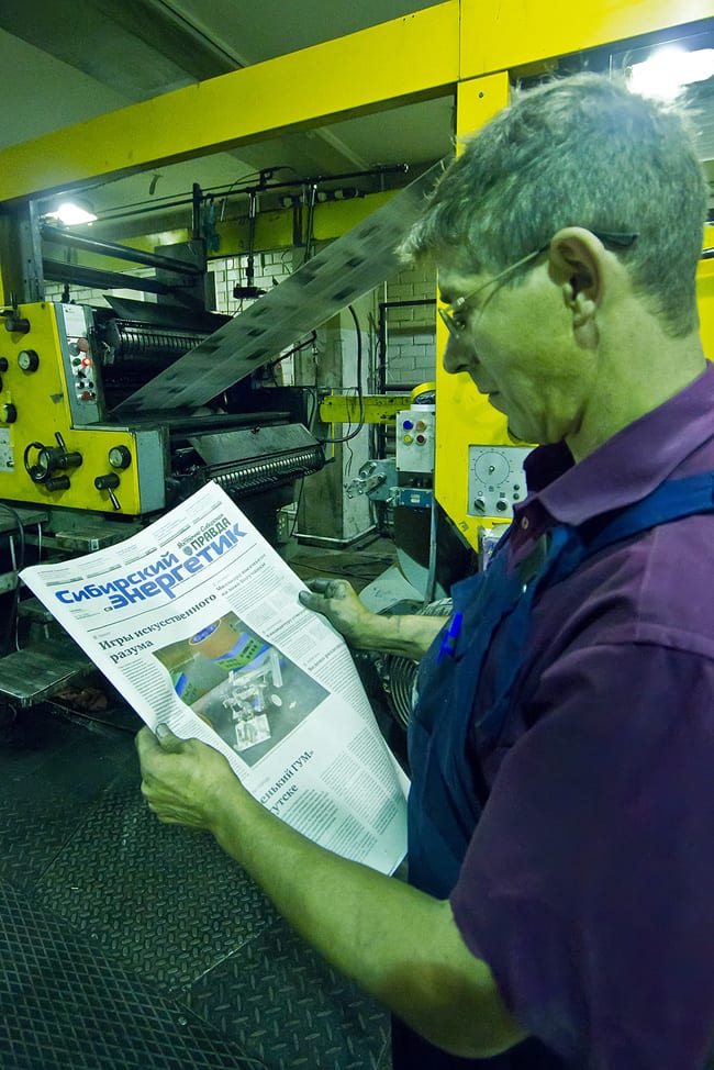 В этом же зале газета собирается и упаковывается. Сотни пачек с газетами через несколько часов заберут экспедиторы. Ранним утором очередной выпуск «Сибирского энергетика» появится в киосках города. В это время вся редакция соберётся на планёрке для обсуждения следующего номера. Кого-то из корреспондентов может не оказаться в офисе. Значит, он уже на интервью или в командировке. Не бывало ещё случая, чтобы газета вышла с единственным сообщением: за неделю никаких примечательных событий не произошло, и поэтому писать не о чем. Даже если всю редакцию свалит грипп, газета всё-таки выйдет, в ней будут обычные рубрики, и читатель не узнает, что в редакции форс-мажор.