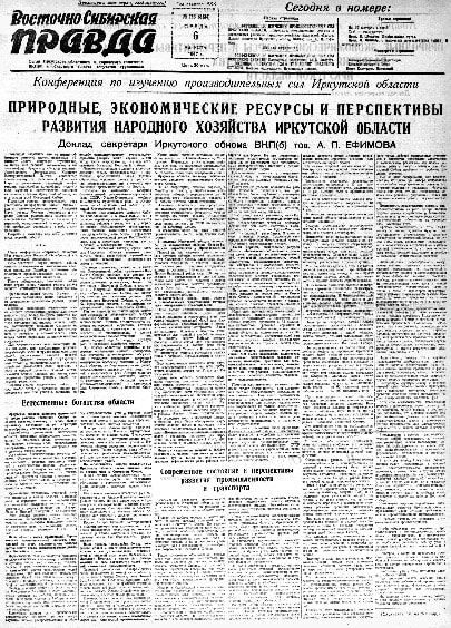Очерёдность проведения конференций была обусловлена той ролью, которую оба региона играли в планах партии и правительства, и разница состояла разве что в том, что Молотовская область была намного ближе к традиционным промышленным центрам, в транспортном отношении развивать её было проще. Зато в Иркутской области за годы советской власти, и особенно в годы войны, были разведаны огромные запасы полезных ископаемых и произведена оценка гидроэнергетического потенциала – область по всем параметрам находилась в полной готовности к рывку в своём развитии, оставалось лишь обсудить очерёдность шагов. Доклад секретаря Иркутского обкома ВКП (б) Ефимова на эту тему занял, видимо, не один час – и почти две полосы в газетах. Ангару в тот момент оценивали как самый мощный в стране источник гидроэнергии: перепад в 380 метров от истока до впадения в Енисей давал 40% энергопотенциала страны. Черемховский каменноугольный бассейн рассматривался не только как источник топлива для тепловых станций, но и как источник сырья для производства искусственного жидкого топлива и коксохимической промышленности. Этот уголь на тот момент был самым дешёвым в стране, причём его, в отличие от украинских и кузнецких углей, можно было добывать открытым способом. Развивать добычу угля в области было особенно выгодно ещё и потому, что на её территории находится восточная часть Канского угольного бассейна и южная часть Тунгусского бассейна – в сумме количество сырья для энергетики и химии оценивалось как неисчерпаемое.