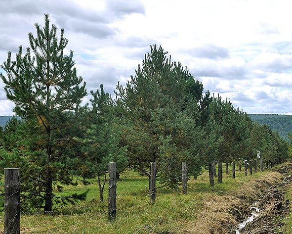 Через час мы уже стоим перед табличкой, сообщающей: «ЛСП. Ангарское лесничество. Охраняется государством». Вдаль уходят ровные ряды невысоких сосен, растущих через равные промежутки. Их посадили 14 лет назад, в 1998 году, а ближе к Ангаре, отделённые минерализованной полосой, растут сосёнки пониже – их высаживали в 2001–2002 годах. Даже на первый взгляд они отличаются разительно – не столь разлаписты, как сосны постарше. Но дело даже не в возрасте: их привезли не из Ангарского, а из Кировского лесхоза, расположенного в Боханском районе. «Шишку здесь ещё не собирают, только на следующий год начнут», – рассказывает наша собеседница, пока мы спускаемся к берегу реки.