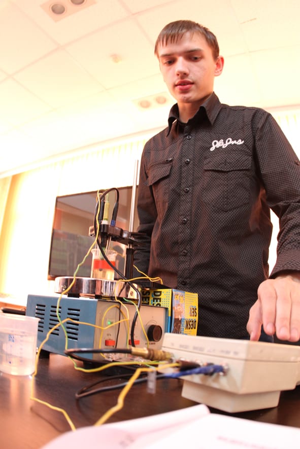 Один из представленных студентами приборов позволяет измерять концентрацию золота в растворе с помощью электродов