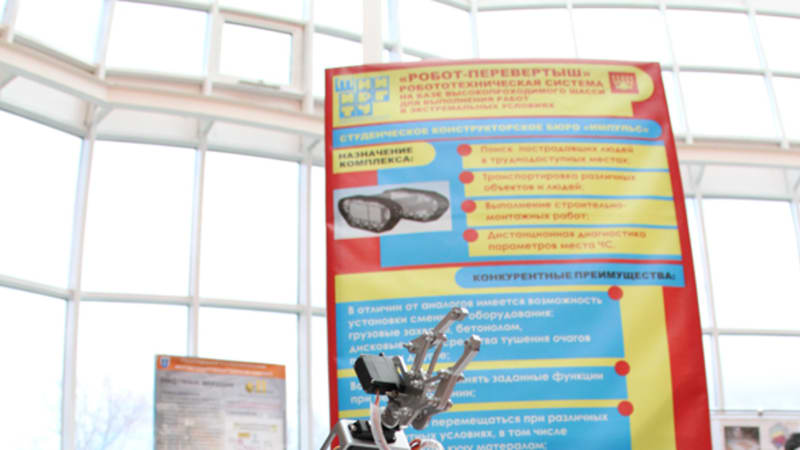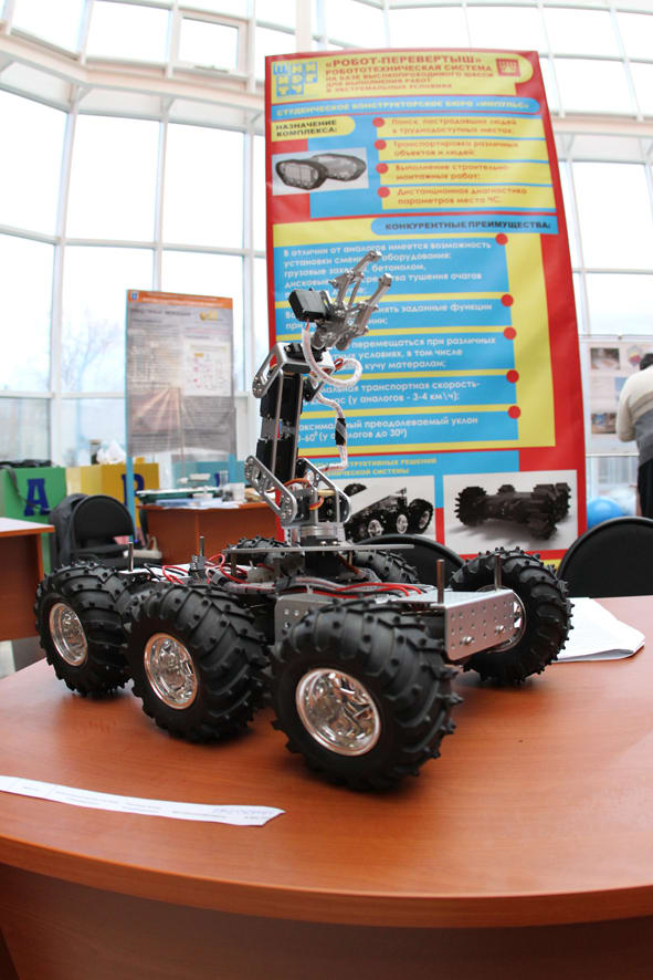 Не менее интересную разработку из области робототехники можно было увидеть и в здании технопарка. Это так называемый робот-перевёртыш: пока он существует лишь в виде модели на колёсном ходу, но, оснащённый гусеницами, сможет переворачиваться и сохранять свою работоспособность даже при падении с небольшой высоты. «Понятий «верх» и «низ» для него существовать не будет», – заметил студент кафедры строительно-дорожных машин НИ ИрГТУ Игорь Рекунов.