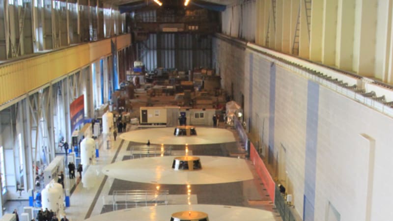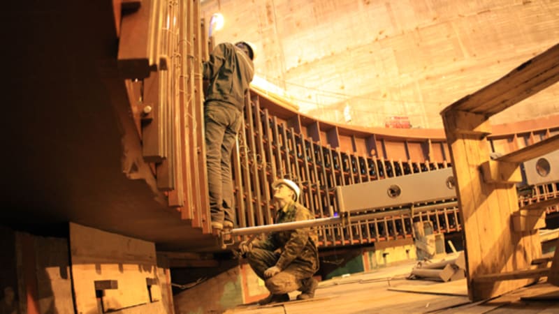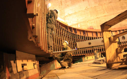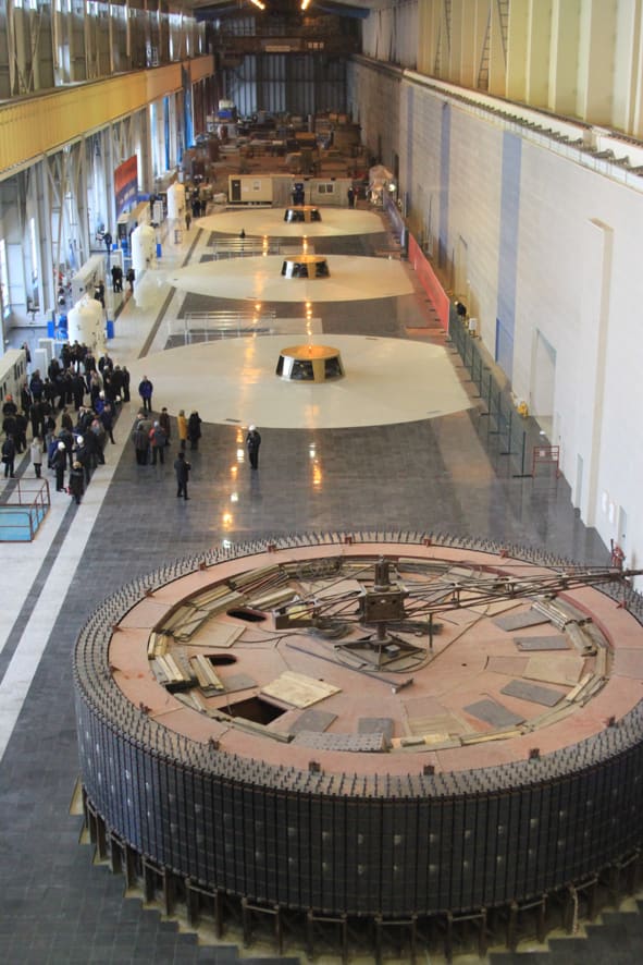Чуть позже Дод рассказал журналистам, что до конца года на станции заработают шесть генераторов. Правда, он не уточнил, идёт речь о промышленной эксплуатации или только о технологическом пуске. Ранее Пашков сообщил, что «скорее всего, в нынешнем году будет только три гидроагрегата». Существующая схема выдачи мощности БоГЭС, состоящая только из ЛЭП под напряжением 220 кВ, и вовсе позволяет запустить лишь две машины, тогда как завершение строительства линий 500 кВ откладывается на несколько месяцев и ввести их в строй планируют в конце 2013 года. Так или иначе, председатель правления «РусГидро» заявил о том, что в первом полугодии следующего года будут включены все девять генераторов. В настоящее время готовы четыре из них, на пятом и шестом монтируют общие системы – трубопроводы для подачи воды, воздуха и масла. На седьмом собирают статор – это самый трудоёмкий процесс во время сборки гидроагрегата, – после чего начнут устанавливать ротор, который уже лежит недалеко от входа в машинный зал. На восьмой машине монтируют направляющий аппарат, а кратер под девятую пока отделён от остального машзала передвижной стенкой: над ним ещё нет крыши, так что работы вести нельзя. Пока её не возвели, рабочее колесо для последнего гидроагрегата, облачённое в кожух, ждёт своего часа на улице, недалеко от причала в нижнем бьефе станции.
