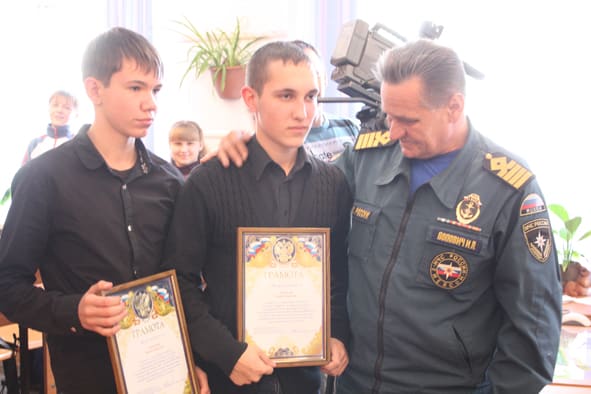 Необычные гости побывали 31 октября в средней общеобразовательной школе №15 Усолья-Сибирского. Сотрудники ГУ МЧС России по Иркутской области наградили двух девятиклассников грамотами за помощь, оказанную сотрудникам Государственной инспекции по маломерным судам при спасении пожилой женщины. В торжественной обстановке Андрей Брухаль и Михаил Горбунов из 9 «А» в присутствиии одноклассников и учителей получили почётные грамоты ведомства.