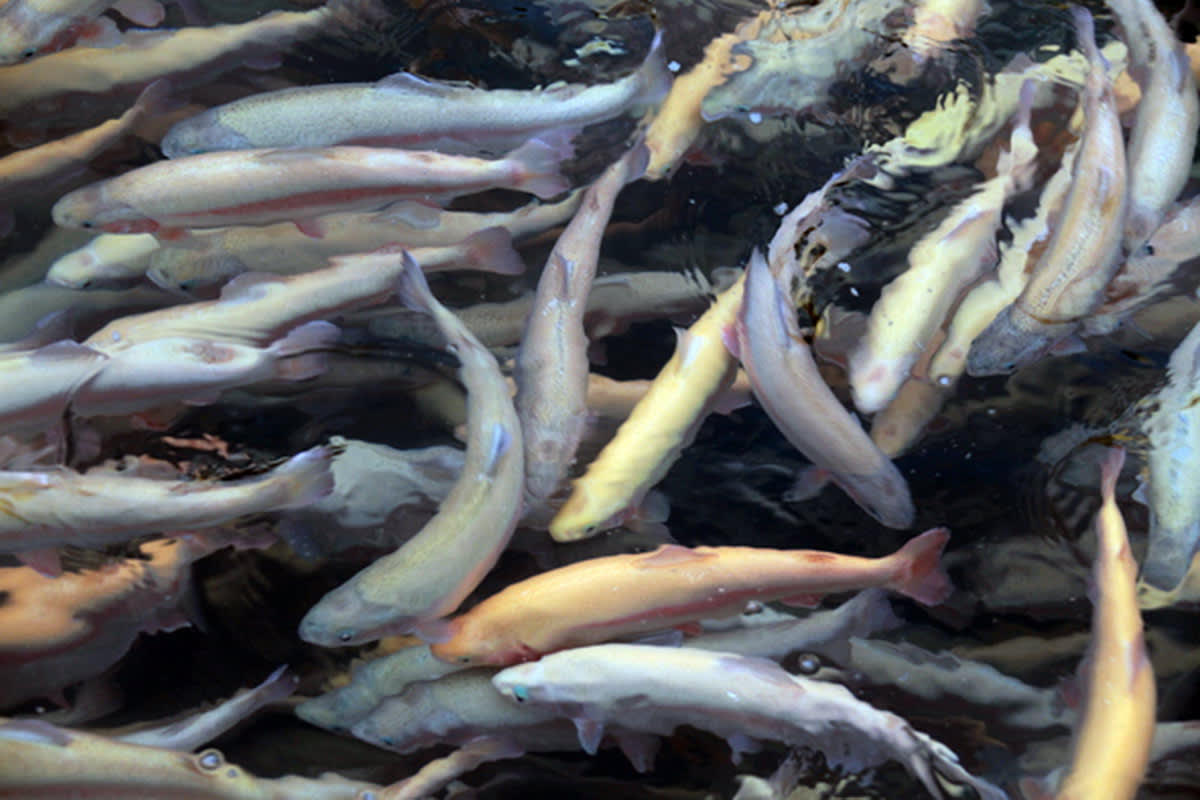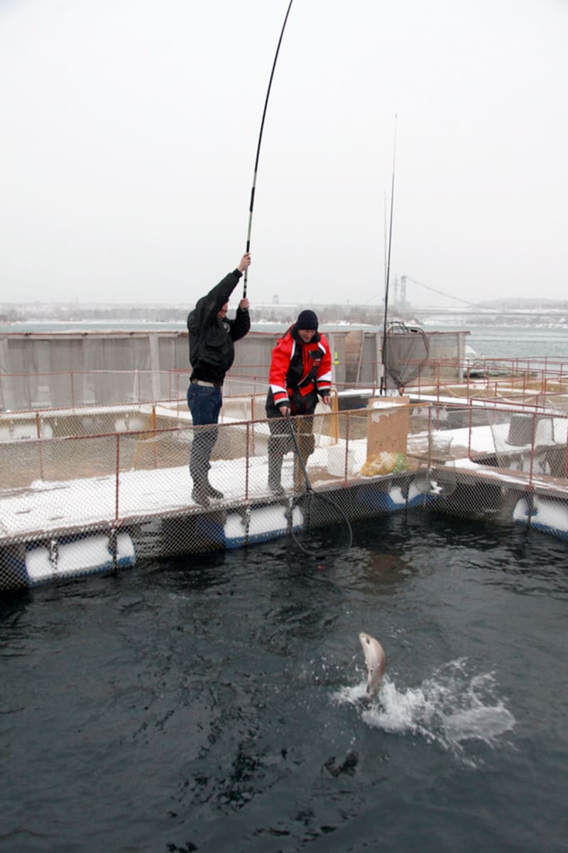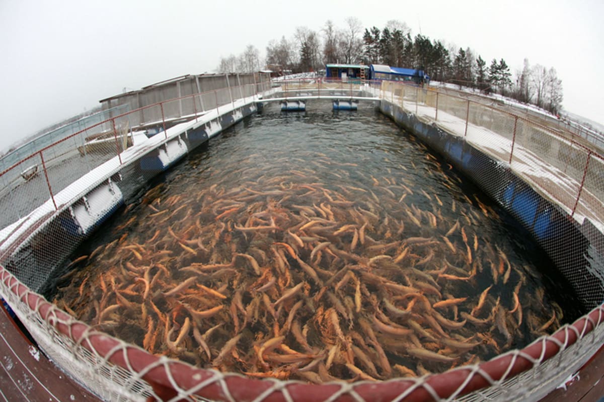 Виталий выходит из домика, набирает корм в пластиковый таз и широкой гор-стью швыряет его в садок, где мало рыбы. Она вяло хватает корм и быстро скрывается в глубине садка. Зато в садке, в котором янтарная форель стоит косяком, при появлении пищи вода начинает кипеть от голодных рыб.