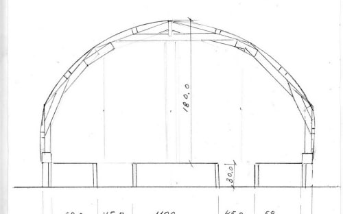 Прежде всего выбрали арочную конструкцию теплицы. Затем материал каркаса арки. Конечно, это был деревянный каркас из доски лиственницы толщиной 40 мм. Конструкцию каркаса разработали с помощью компьютерной программы «Автокад». Это была арка из ломаных элементов шириной 3500 мм и высотой 1800 мм. Эти арки устанавливались с шагом 2000 мм на основу из бруса лиственницы 100х180 мм, приподнятую на 200 мм над уровнем земли. Вдоль теплицы в коньке продольно устанавливалась доска, в которую упирались и крепились полурамы арки каркаса. С наружной стороны на конструкции арок вдоль теплицы были установлены продольные бруски для крепления панелей из сотового поликарбоната. Высота этих брусков зависит от места расположения для того, чтобы получить арочную конструкцию. Необходимо только обратить внимание на надёжность крепления панелей поликарбоната.