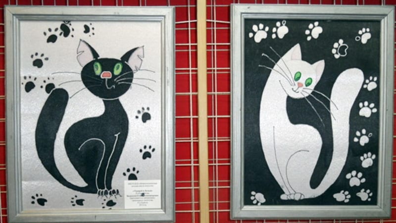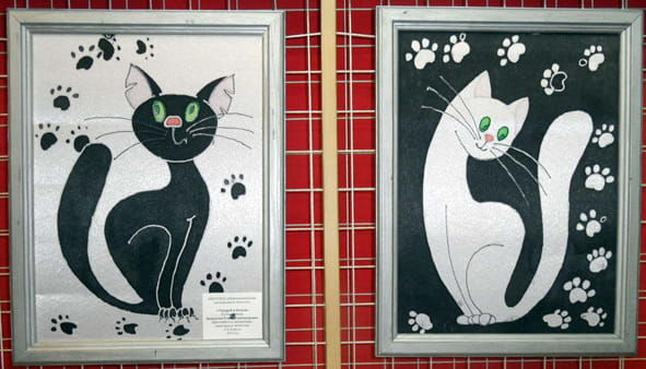 Очаровательные кошки радуют посетителей своим многообразием. Присутствующие с неподдельным интересом рассматривают тематические композиции, выполненные в технике лоскутного шитья и батика, изделия из керамики, бересты, теста, дерева, сшитые из текстильных материалов, вязаные, валяные и другие.