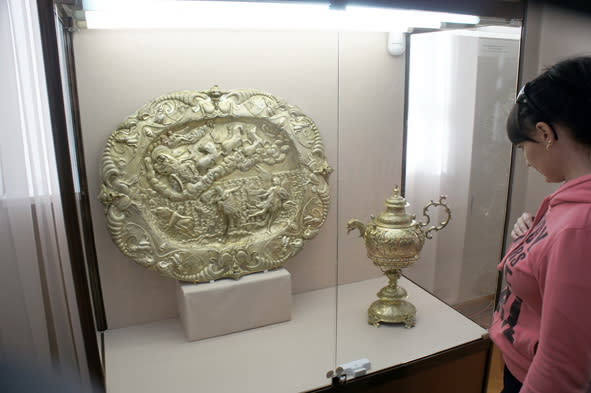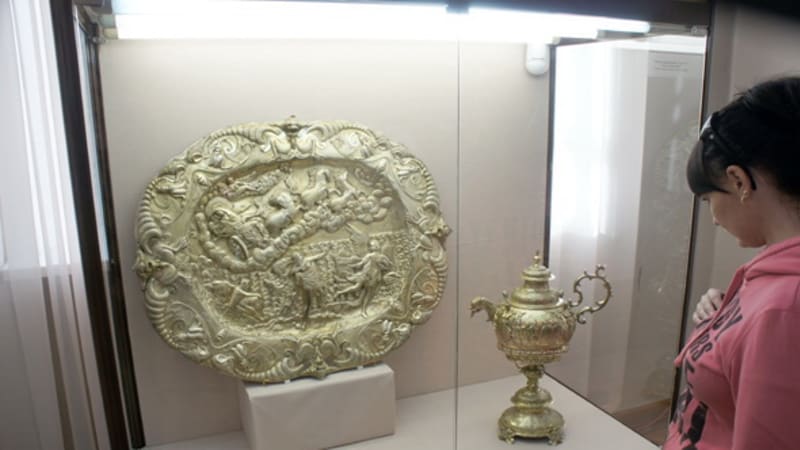 Особое место на выставке занимает группа мемориальных серебряных изделий, связанных с освоением Сибири в XVIII веке. Среди них – серебряная кружка, выполненная в начале XVIII столетия иностранным мастером, пожалованная Петром I в 1708 году иркутскому воеводе стольнику Лариону Акимову Синявину за «ево к нам государю верную службу и радение»; выдающиеся по своим художественным качествам изделия мастеров Тобольска, выполненные для Дениса Ивановича Чичерина, губернатора Сибири. Предметы из сервизов принадлежали семье губернатора и изготовлены мастером-серебряником Петром Шимгиным. Он виртуозно владел техникой чернения драгоценных металлов, которой славились русские мастера. Рядом с этими предметами экспонируется табакерка, выполненная, скорее всего, по заказу Чичерина. На её крышке рельефом нанесена карта Сибири с обозначением сибирских рек и поселений, а на дне табакерки – карта восточной части России от Якутска до Анадыря, на которой особо отмечены «вновь сысканные Алеутские острова».