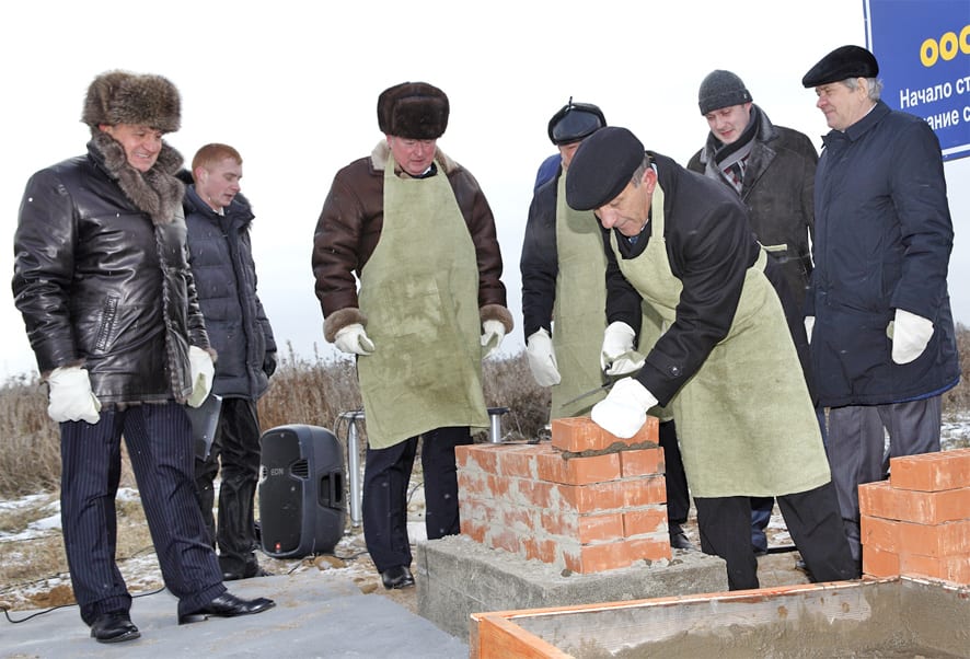 В холодный день в чистом поле, открытом всем ветрам, можно было видеть солидных мужчин, облачённых в фартуки, с мастерками в руках. Стопа кирпичей и чан с цементным раствором подтверждали серьёзность их намерений. Заместитель министра сельского хозяйства Иркутской области Юрий Бажанов, мэр Тайшетского района Виталий Кириченко, генеральный директор торговой компании «Тайшетторг» (одновременно руководитель  СХП «Маяк») Владимир Сорокин и председатель Союза предприятий пищевой и перерабатывающей промышленности Дмитрий Баймашев проявили немалую сноровку в ремесле каменщика, заложив не совсем уж и символическую кладку стены будущего свинокомплекса.