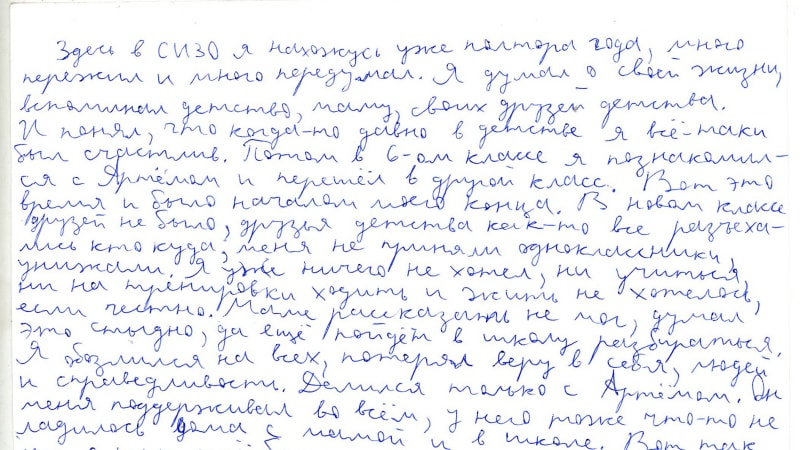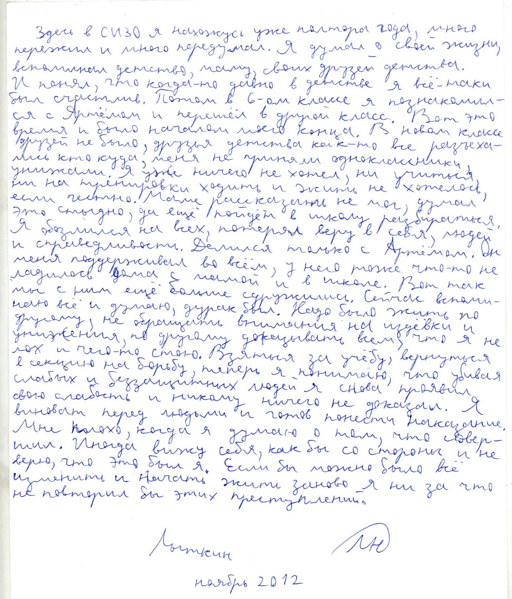 «Здесь в СИЗО я нахожусь уже полтора года, много пережил и много передумал. Я думал о своей жизни, вспоминал детство, маму, своих друзей детства. И понял, что когда-то давно в детстве я всё-таки был счастлив. Потом в 6-ом классе я познакомился с Артёмом (Ануфриевым. – Ред.) и перешёл в другой класс. Вот это время и было началом моего конца. В новом классе друзей не было, друзья детства как-то все разъехались кто куда, меня не приняли одноклассники, унижали. Я уже ничего не хотел, ни учиться, ни на тренировки ходить и жить не хотелось, если честно. Маме рассказать не мог, думал это стыдно, да ещё пойдёт в школу разбираться. Я обозлился на всех, потерял веру в себя, людей и справедливость. Делился только с Артёмом. Он меня поддерживал во всём, у него тоже что-то не ладилось дома с мамой и в школе. Сейчас вспоминаю всё и думаю, дурак был. Надо было жить по другому, не обращать внимания на издёвки и унижения, по другому доказывать, что я не лох и чего-то стою. Взяться за учёбу, вернуться в секцию на борьбу, теперь я понимаю, что убивая слабых и беззащитных людей я снова проявил свою слабость и никому ничего не доказал. Я виноват перед людьми и готов понести наказание. Мне плохо, когда я думаю о том, что совершил. Иногда вижу себя как бы со стороны и не верю, что это был я. Если бы можно было всё изменить и начать жить заново я ни за что не повторил бы этих преступлений. Лыткин, ноябрь 2012».