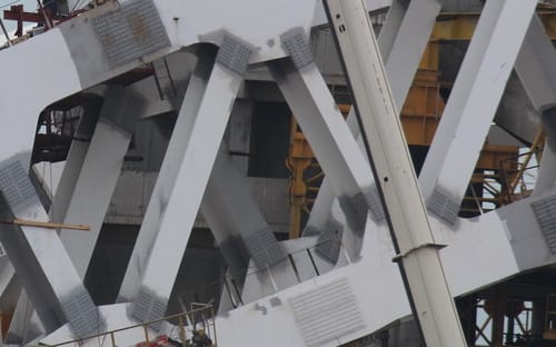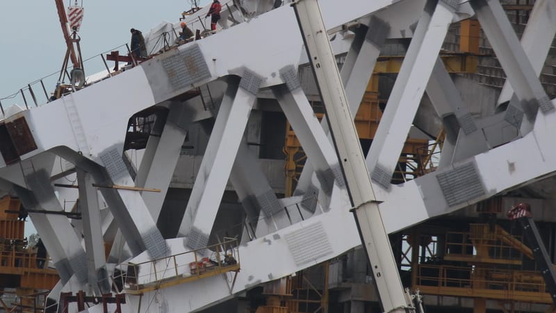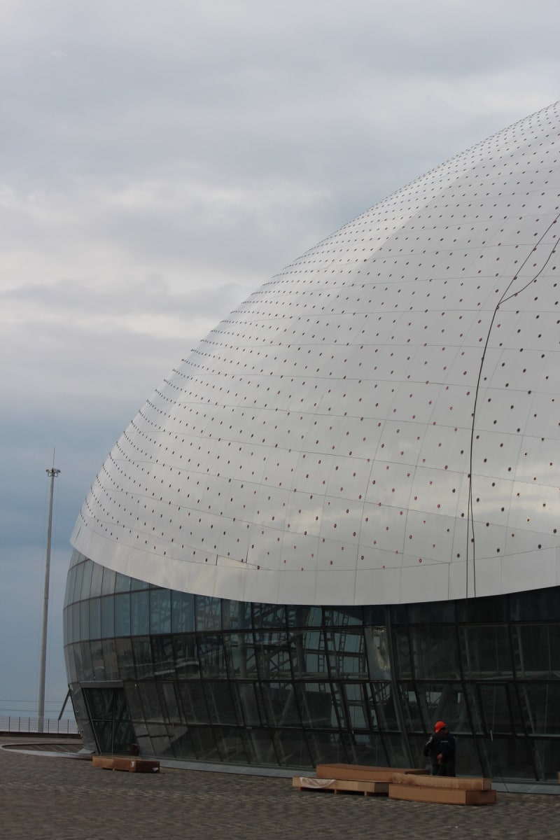 Утро, тёплый дождь. Олимпийский парк. Стилобат ледового дворца «Большой» (объект Международной федерации хоккея с шайбой на 12 тысяч мест, который после Олимпиады станет принимать не только спортсменов, но и артистов. Юрий Башмет, к примеру, уже выступал перед строителями в касках). «Большой» похож на огромный шар, каплю или летающую тарелку… Её спина покрыта точечками. Это медиа-фасад. «Последнее слово светодиодной техники, – довольно говорит старший прораб компании «Минисвязьстрой» Вадим Завьялов. – 39 тысяч лампочек, каждая лампа индивидуально управляется, поэтому можно рисовать любые картинки». 39 тысяч лампочек расположены на довольно обширном выпуклом экране, примерно 100 на 100 м. Сложных картин не будет, зато будут эффектные. На фасаде висят 20 альпинистов, которые вручную монтируют каждую лампочку.
