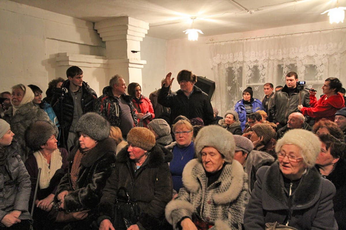 Маленький домик, русская печка, фотообои с берёзами – декорации для повторных общественных слушаний в Мельничной Пади, которые сразу обещали быть очень напряжёнными. Накануне Нового года в сельском клубе собралось больше полусотни человек. На входе всех прибывших выжимало прямо к столу регистрации, за которым сидели женщины из земельного муниципального отдела. Они записывали участников, заодно заражая их духом общественного собрания.