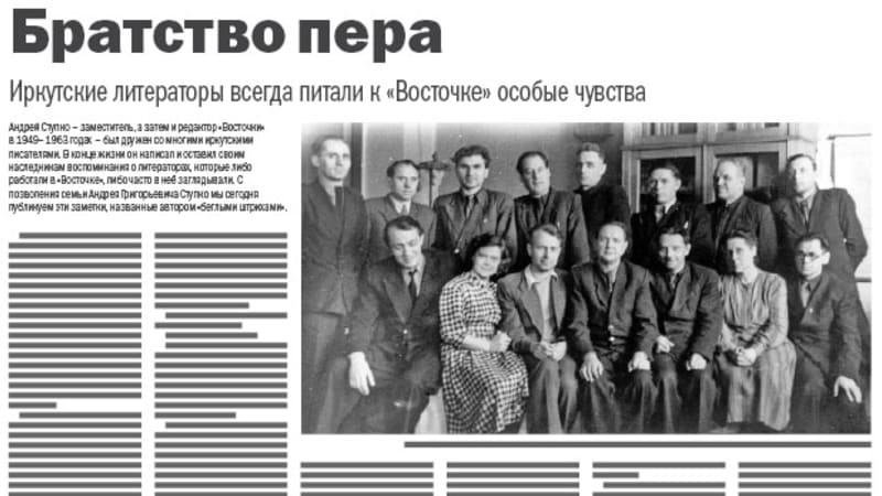 Сподобило меня написать вам свой отклик «Братство пера» дорогого моей памяти Андрея Григорьевича Ступко. И хотя заголовок его заметок, видимо, принадлежит не ему, но и мне хорошо помнятся особые чувства к «ВСП» иркутских писателей и поэтов. И не только иркутских… Все упомянутые автором на больших четырёх полосах литераторы так или иначе мне были знакомы встречами при разных обстоятельствах. Конечно, в годы моей молодости. Даже с Сергеем Венедиктовичем Сартаковым пообщался в самом начале газетного пути. Помню, как он рассказывал, почему только что застрелился Фадеев. А я от него ещё добивался узнать, почему он в своей книге назвал Нижнеудинск Шиверском…