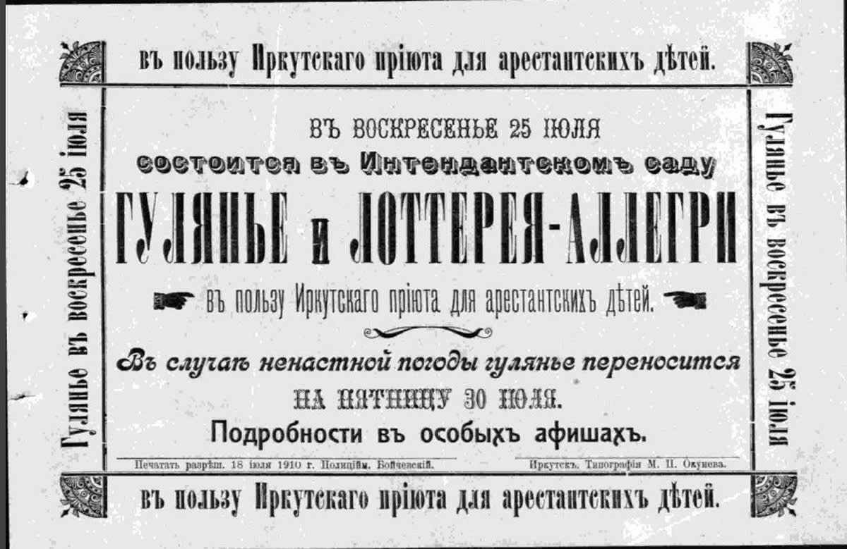 В Иркутске четвёртый год работала бесплатная детская столовая имени архиерея Тихона – исключительно на пожертвования прихожан. Воспитанницам Института Николая I было приятно делиться с бедными детьми сахаром, а фирме Щелкунова и Метелёва – собирать для них вкусный паёк. Мещанин Ковалёв, не располагавший свободными деньгами, помогал тем, что брал на себя починку самовара, мещанка Евтифеева дарила столовой фикусы, а дворянка Янушевич шила передники для раздатчиц. И даже держатель извозчичьей биржи Сухих был чрезвычайно полезен – тем, что давал лошадь для доставки продуктов.