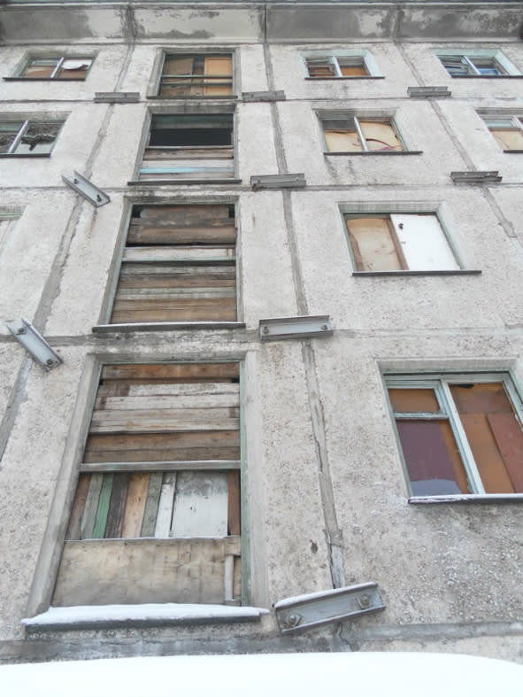 После выселения жителей двух подъездов их квартиры превратились в руины: окна выбиты, полы выдраны, двери сняты. В данный момент первый этаж шестого подъезда заложен кирпичом, а остальные окна так и стоят без стёкол. Эти «глазницы» видны со всех сторон дома», – говорилось в коллективном письме жителей в администрацию. Однако людей волнует не только эстетическая составляющая: «Плата за квартиры взимается такая же, как и в нормальных домах, так и условия проживания тоже должны быть нормальными. Требуется провести ремонт дома, благоустроить территорию, обустроить детскую площадку во дворе, так как в доме проживает много детей. А также хотелось бы получить ответ на вопрос, какие меры будут приняты в дальнейшем».