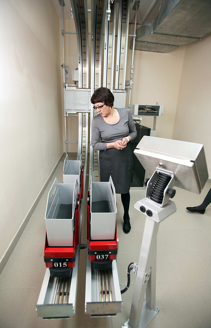 – А теперь посмотрите наверх, – говорит Наталия Напартэ. Мы на третьем этаже. Прямо по потолку холла, извиваясь, уходит куда-то в стену часть странного механизма. Чувствуешь себя как в недрах космического корабля. Рельсы, чем-то похожие на детскую железную дорогу, только, естественно, куда крупнее. «Это монорельсовая транспортная система «TELELIFT», – поясняет Наталия. – На третьем и пятом этажах рельсы проходят по потолку прямо в холлах, так что читатели смогут увидеть, как пробегает тележка с книгами». На каждом этаже с первого по шестой стоят по две «станции» приёма книг. Мира Попова, заведующая отделом абонемента, открывает дверь в особую комнату. Внутри – одна из станций системы «TELELIFT». Звук в комнате гулкий. Рельсы с поверхности пола круто уходят прямо по стене в шахту. Рядом с рельсами – пульт управления. На нём библиотекарь набирает код книги, посылает команду, и из недр хранилища в подвале по шахтам к нему мчится тележка с книгами. Она может бежать как по горизонтали, так и по вертикали, за счёт инженерного решения ни одна книга на крутых поворотах не вывалится.
