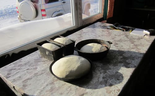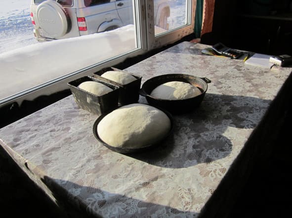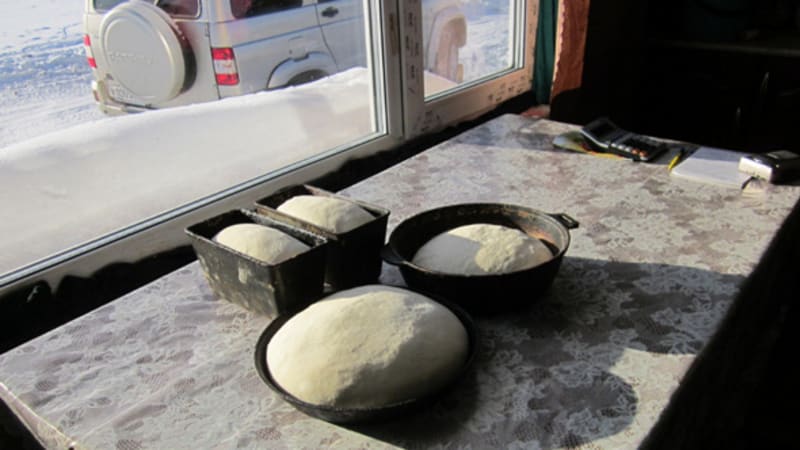 Старосту общины в Кадарее мы дома не застали. Несмотря на 40-градусный мороз, Евсей Алексеев ушёл спозаранку вместе с четырьмя взрослыми детьми на лесосеку – заготавливать брус для строительства очередного дома. Сыну Евгению, у которого в прошлом году родился пятый ребёнок, стало тесно в усадьбе. Нежданных гостей принимала Надежда Юдовна, супруга старосты. Мы застали её за выпечкой хлебов: замесив тесто, она уложила его в чугунные формы, чтобы «подошло», прежде чем ставить в русскую печь. Надежда Юдовна просила её не фотографировать, но рассказать о том, как живёт семья на новом месте, всё же согласилась.