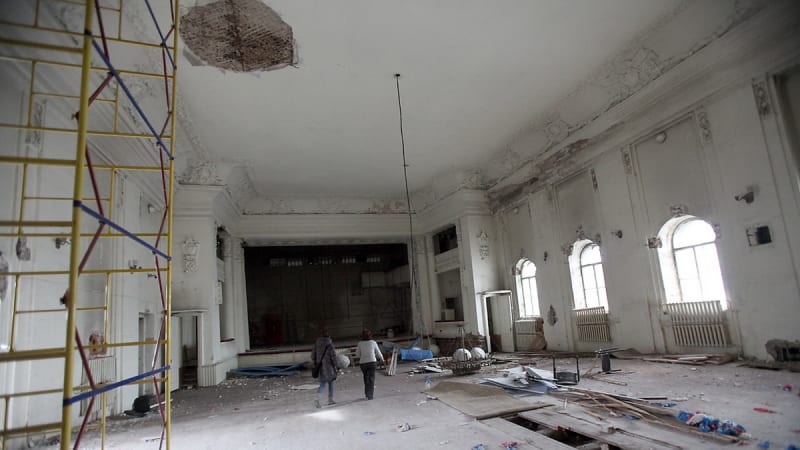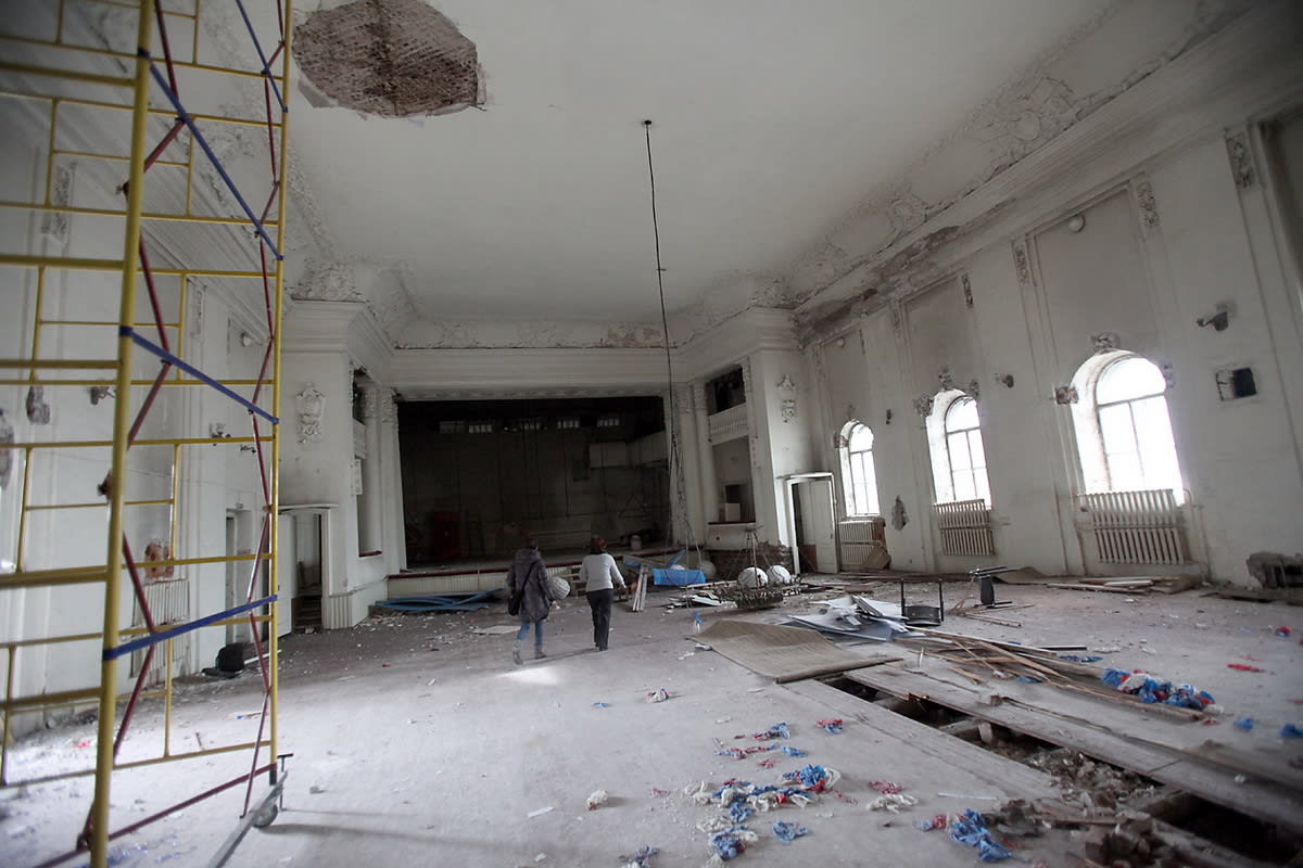 В двери поворачивается ключ, и Людмила Валентиновна предлагает нам зайти в так называемый большой зал, где хоть раз бывали многие иркутяне. Закрыт он давно – если бы не строительный мусор под ногами и люстра, лежащая на полу, как сбитая летающая тарелка, помещение можно было бы назвать пустым.