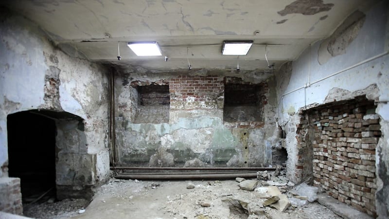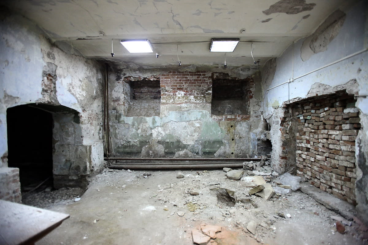 До того, как дом был передан Красной Армии, в нём было представительство командования Министерства внутренних дел. Эти структуры, так же как и Минобороны, не оставили после себя никаких документов. Это осложняет реставрацию. Но самое главное, что все входы и выходы были замурованы – мы идём по подвалу, подсвечивая путь телефонным фонариком. Луч выхватывает заложенные кирпичом оконные и дверные проёмы.