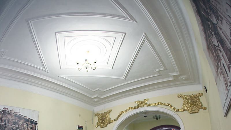 – Здесь у меня задачи было две: оценить состояние строительных материалов и определить, какой была первоначальная отделка. Надо сказать, мы с вами сейчас присутствуем не в первоначальном объёме, а в части здания, которую начали строить сразу после окончания войны в 1945 году. Видите, по стенке идёт вскрытие? – продолжает наш гид, указывая на снятую штукатурку. – С одной стороны одна кирпичная кладка, с другой – другая. По оси, на которой мы стоим, проходила стена особняка, построенного в 1883 году. А в 1945-м эту стену разобрали и ввели новый объём. Причём, как говорят архитекторы, очень удачно. Время было сложное, денег не было совсем, тем не менее каждый кирпичик использовали. Кирпич абсолютно старый, его где-то, пардон, подобрали и применили. Делаю обследование декора и вижу, что не было ни нормального гипса, ни нормальной проложки, чтобы отливать форму, тем не менее всё сделано. Реставрация тем и хороша, что мы испытываем почтение и к тем, кто строил в 1883 году, и к тем, кто удачно перестроил в 1945-м.