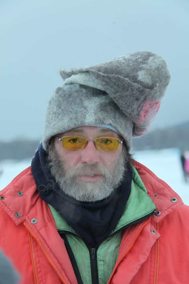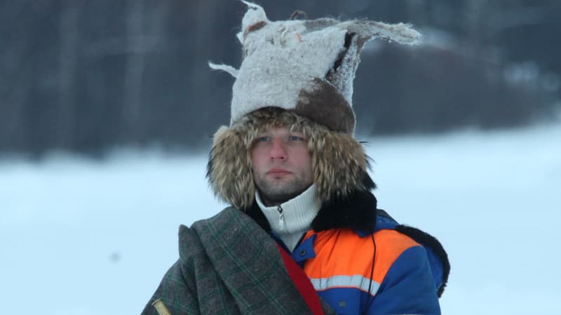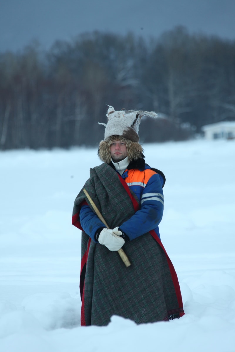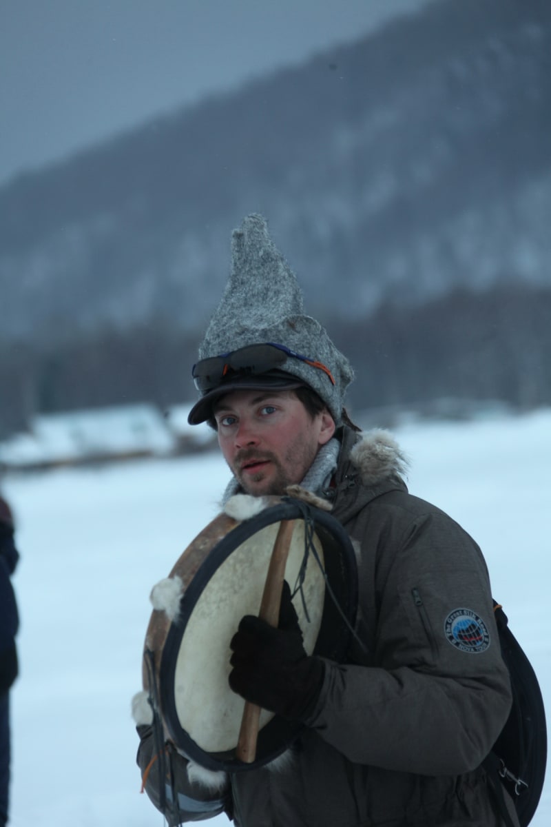 Погуляв чуть-чуть вокруг лабиринта, чтобы не натоптать слишком сильно и не испортить внешний вид заснеженной конструкции, мы пошли к берегу. В деревянном домике с вывеской «Кафе» наконец-то увидели людей, которые самолётами и поездами стянулись со всей России на Байкал, чтобы помолчать. Приготовления идут в тепле. Взрослые разбирают и примеряют шапки, разыскивают потерявшиеся барабаны, дети творят разноголосицу. Войлочные головные уборы «театриканцы» валяли сами в Москве. Процесс сложный, но результат того стоил: огромные серые шапки, в которые облачились все участники акции, одновременно наводили страх и заставляли верить в серьёзность происходящего.