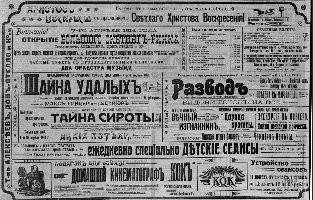 Для обывателя они выглядели конкурентами: на одной улице крутили одни и те же фильмы, оба содержали площадки для катания на роликовых коньках. Но всякий деловой человек понимал, что у Донателло совершенно иные масштабы и вся территория за Байкалом вплоть до Харбина и Владивостока представляет сферу его влияния. Четыре года назад, когда Ягджоглу перестраивал арендованный им кинотеатр и жил в гостинице, Антонио Донателло был не только король проката, но и солидный акционер кинофабрик, организатор съёмок местной хроники. И с той поры его положение лишь укрепилось: недавно он объединился в товарищество с прокатчиком Алексеевым, а документальное производство довёл до такого совершенства, что от съёмок до демонстрации фильма уходило менее 10 дней. Единственное, в чём Ягджоглу обошёл и Омск, и Томск, и самого Донателло, – это скетинг-палас – специальное тёплое и уютное помещение для катания на роликовых коньках. Итальянец располагал в Иркутске лишь скетинг-ринком, то есть летней площадкой, зависимой от перемены погоды и, конечно, не такой комфортной, как детище Константина Семёновича. У него и зрительный зал отличался необыкновенным плафоном и был предметом гордости. В чём, в чём, а уж в этом он не уступал, денег «на красоту» не жалел, предпочитая экономить на другом.