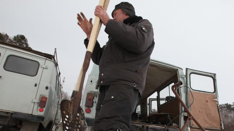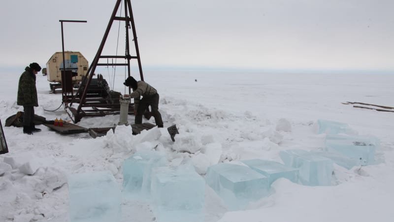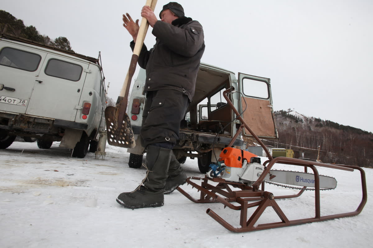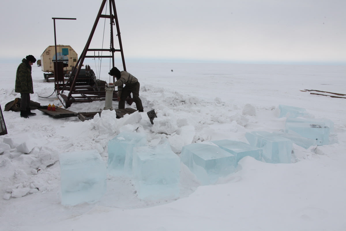 – В начале апреля на поверхности льда натаивает до двадцати сантиметров воды, ходим по колено в воде, – рассказывает Николай Михайлович. – Но это ещё не опасно: опасно работать с тяжёлой техникой становится, когда лёд снова сухой – вода уходит сквозь него, а значит, изменилась структура льда, пора уезжать… Двадцать лет назад мы были молодыми и жили прямо на льду – вытаскивали туда избушки. Сейчас все уже зрелые мужи, немного ленимся – на лёд ездим только работать, ночуем на берегу.