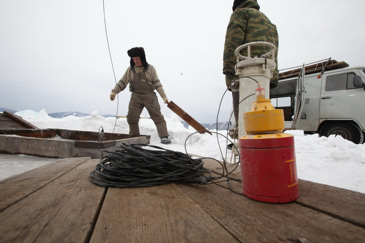 Мы выезжаем на лёд, а по дороге Николай Буднев объясняет, что должно произойти. Созданная учёными аппаратура называется «притопленной буйковой станцией» или «глубоководной электрометрической установкой». Это две пары датчиков и блок электроники, соединённые экранированным тросом-кабелем. Одна пара, примотанная к металлической болванке – метровому обрезку обычного рельса, опускается на максимальную глубину, которая в этом месте составляет 1300–1360 метров. Вторая пара болтается на притопленном поплавке под поверхностью воды на глубине пятнадцати метров – с учётом того, чтобы буй не цепляли проходящие суда и сети рыбаков, не било волнами летом и он не вмерзал в лёд зимой. Блок электроники висит под водой на другом буе на некотором расстоянии, чтобы не создавать помехи.