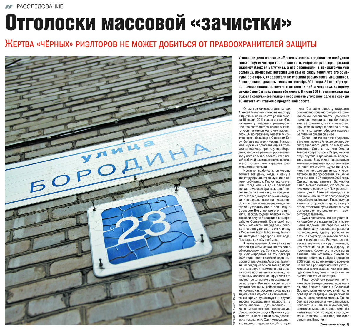 К этому времени его квартира уже была продана. Об этом свидетельствует договор купли-продажи от 25 декабря 2007 года, заключённый между Алексеем Балуткиным и жительницей посёлка Качуг Оксаной Амосовой. «Продавец» утверждает: о том, что потерял квартиру, узнал только после того, как врачи передали ему паспорт со штампом о прекращении регистрации. По словам сотрудников больницы, сейчас уже вряд ли кто-то вспомнит, как документ оказался в отделении. Одни говорят, что паспорт передал какой-то мужчина. Другие припоминают, что документ принесла женщина.