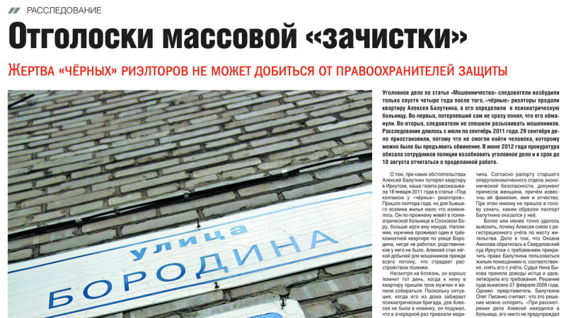 За судьбой Алексея Балуткина «Восточка» следит с 2010 года. За это время материалы о пациенте областной психиатрической больницы, расположенной в посёлке Сосновый Бор, дважды появлялись на страницах газеты – «Под колпаком у «чёрных» риелторов» 18 января 2011 года и «Отголоски массовой зачистки» 10 июля 2012 года.