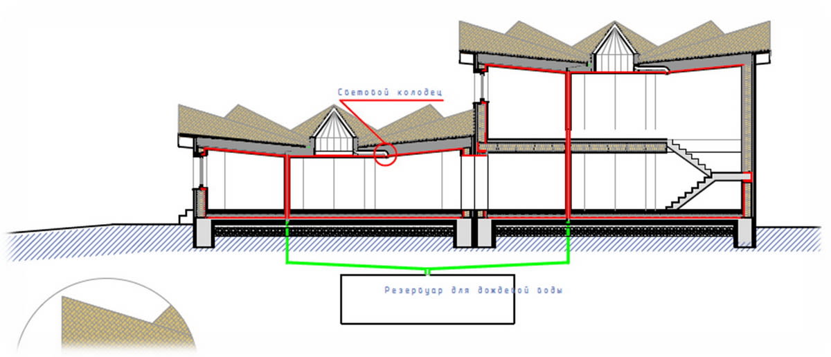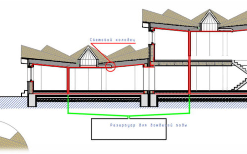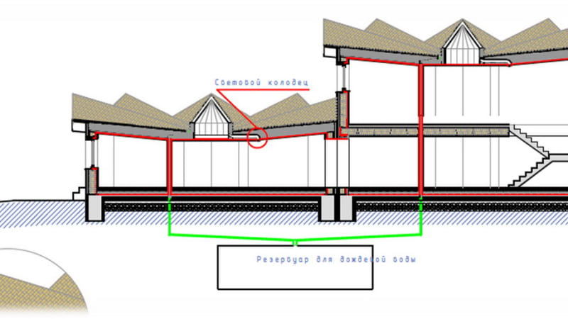 Каждый метр на крыше домов задействован. Помимо установок для сбора воды, на ней расположены солнечные коллекторы. Они имеют немаловажную функцию заряда батарей от городской сети при продолжительной облачности. Кроме того, разработчики предложили использовать световые колодцы. Все окна в доме должны располагаться только с южной стороны, это наиболее рационально, пояснила Татьяна Леник. Поэтому для дополнительного освещения в здании имеются световые колодцы. «Задача такого колодца – собрать как можно больше солнечного света, перенаправить его по счетоводной трубе и рассеять по всему внутреннему пространству помещения. При этом один световой колодец диаметром 300 миллиметров способен освещать площадь в 8 квадратных метров и предотвращать ежегодный выброс в атмосферу до 7,4 тонны углекислого газа», – добавила Татьяна Леник.