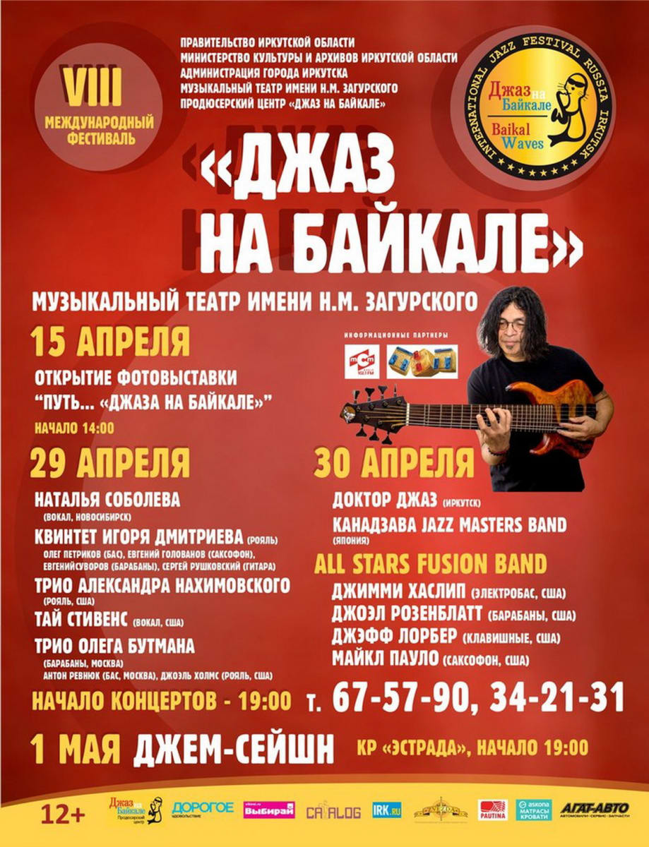 Следом на иркутскую сцену поднимутся джазмены из Японии с проектом Jazz masters Band из города-побратима Иркутска Канадзавы. Лучшие джазовые мастера японского происхождения собрали специальный проект для выступления на фестивале «Джаз на Байкале», необычная программа будет впервые исполнена в Иркутске. То, что они будут играть, станет в определённой степени экзотическим сюрпризом для пуб-лики, однако Александр Филиппов заверяет, что в Японии джаз играть умеют очень профессионально, чему он и его коллектив стали свидетелями, когда побывали на подобном иркутскому фестивале в Канадзаве.