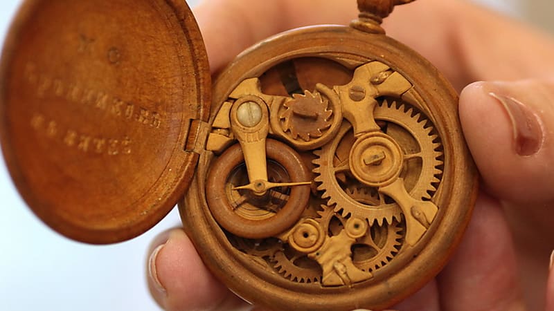 – Нет, конечно, – смеётся Нина Крылова. – Мастера делали карманные часы, их диаметр обычно был около 3-4 сантиметров. У наших часов корпус, детали механизма, циферблат изготовлены из капа, или капкорня, – наростов на стволе и корнях берёзы. Оси, трибы, винт, крепления оси баланса, накладные пластинки для обозначения цифр часовой шкалы – из слоновой кости. А пружина и волосок баланса – из стали.