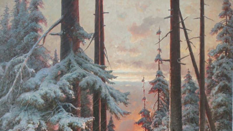 «Я всякие пейзажи пишу, но по-настоящему знаю солнечный закат в различные его моменты и корявые деревья, изогнутые непогодой и ветрами. Я потратил много времени, чтобы изучить цветовую гамму закатов солнца, многообразие вечернего освещения неба и предметов природы. Такую картину я могу написать в любой момент и при любых обстоятельствах». Так на склоне лет говорил почитателю своего таланта Юлий Юльевич Клевер. Никто из посетителей Иркутского художественного музея, попадая в залы русского искусства второй половины 19 века, не может пройти мимо картины этого художника «Зимний закат в еловом лесу», написанной в 1889 году. Контрасты ближнего и дальнего планов, эффекты красочных сочетаний, узловатые стволы старых елей, вздымающихся в небо, подтаявший снежный покров и атмосфера таинственности и тишины завораживают и приковывают внимание к полотну.