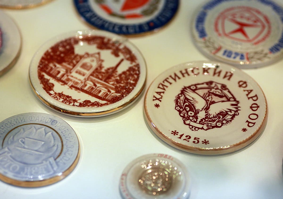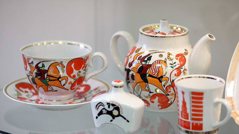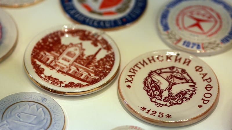 Какие только эскизы они не делали! Была целая серия фарфоровых предметов, посвящённых Александру Пушкину: на чайнике портрет самого поэта, на блюдах и чашках – герои его произведений. «Многие экземпляры делались вручную, роспись тонкая, очень красивая. – Андрей любуется своими сокровищами. – Нежная роспись, просто завораживает!» «50–60-е годы для советского фарфора – это золотой век. Художники переживали взлёт, особенно красивы послевоенные изделия. Люди так соскучились по красоте, что даже в посуде чувствуются цветы радости, возрождения. А посмотрите, какой фон росписи – светлый, радостный», – добавляет Нина Крылова. «На Хайтинской фабрике вообще во все времена было очень много отличных мастеров, существовала своя художественная лаборатория», – Андрей Наширбанов ведёт нас к следующей витрине. Тонкая золотая «сеточка» покрывает чайник, струящиеся нити золота стекают вниз под пышным букетом цветов – эта роспись называется «Русский платок». Возможно, она принадлежит руке знаменитой хайтинской художницы Раисы Алёшиной, но достоверно это неизвестно. Иногда по форме рисунка, изображению цветка можно определить автора. К примеру, живописцу Егорову удавались очень лёгкие, воздушные розы.