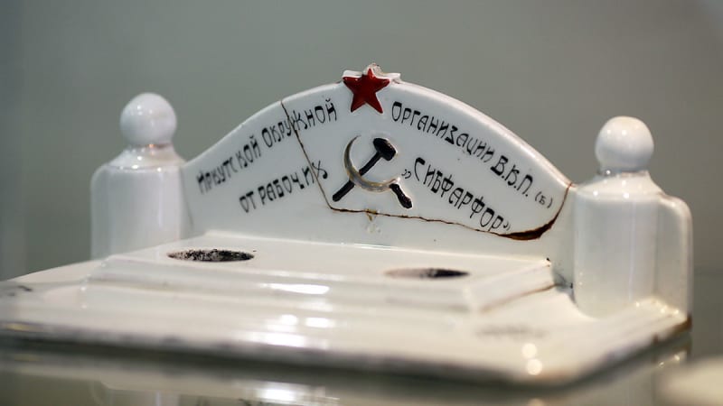 «Иркутской окружной организации ВКП(б) от рабочих Сибфарфора», – гласит надпись на большой фарфоровой чернильнице. «Она некомплектная, – говорит усольчанин Андрей Наширбанов, собирающий собственную коллекцию с 2008 года. – Тут ещё подставка должна быть и стаканчики». В этот четверг в Ангарском музее часов коллекционер открыл выставку хайтинского фарфора из собственного собрания. На выставке представлено 327 предметов. Андрей признаётся: он полюбил фарфор 40–60-х годов 20 века, время расцвета советского фарфорового искусства. Фабрика много раз меняла названия, это видно по разнообразным клеймам, но уже в 1950 году промартель «Хайтинский труд» (так она тогда называлась) выпускала продукции на 200 тыс. рублей в год, а художники освоили 36 видов художественной росписи.