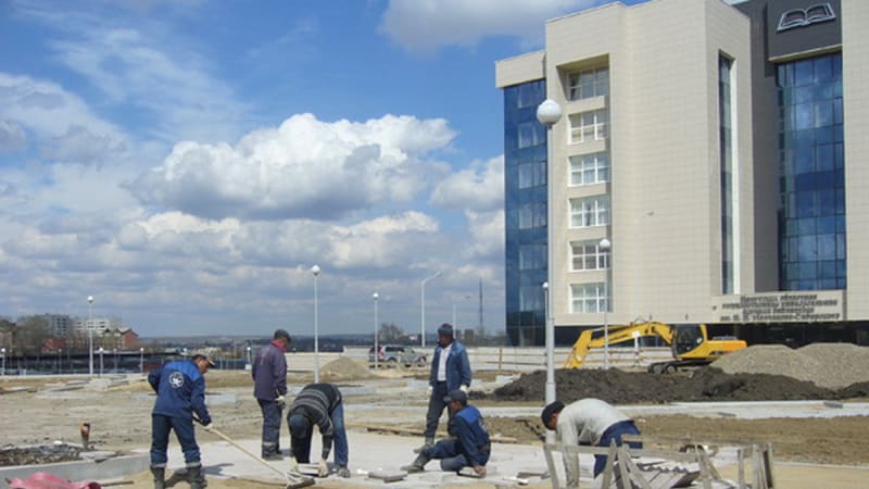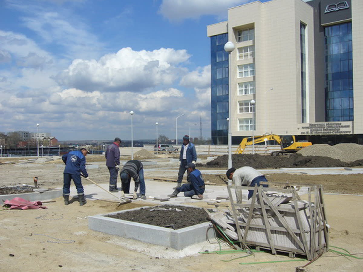 На площадке задействованы десяток рабочих, экскаватор, погрузчик, пять самосвалов. Формируется бригада плиточников, которой предстоит уложить более трёх тысяч квадратных метров дорожек.