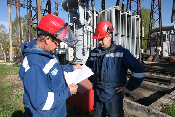 Виктор Борисов (на фото слева) отвечает за безопасность сотрудников ремонтных бригад, которые работают на высоковольтном оборудовании. Валерий Лыткин и его коллеги получили допуск накануне, тем не менее наряд нужно проверить ещё раз