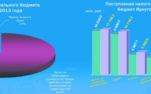 Управление Федеральной налоговой службы по Иркутской области опубликовало данные о поступлениях в бюджет за январь–апрель 2013 года. Так, в консолидированный бюджет Российской Федерации (без учёта ЕСН, зачисляемого в федеральный бюджет) от налогоплательщиков, территориально расположенных в Иркутской области, за январь–апрель 2013 года мобилизовано 46 млрд. 214,9 млн. рублей, что на 1 млрд. 294,2 млн. (или на 2,9%) выше уровня поступлений аналогичного периода 2012-го.