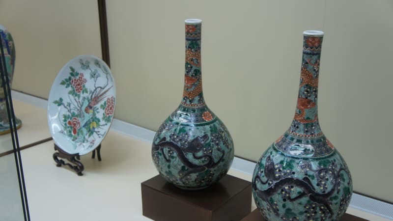 Тулова двух парных сосудов в соседней витрине украшают драконы, спрятавшиеся в листьях и гроздьях винограда. Изображения трёх грациозных драконов – красного, зелёного и коричневого, обвивающих тулово и горлышко сосудов, вторят побегам винограда, оплетающим сосуды изысканным орнаментом.
