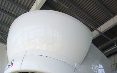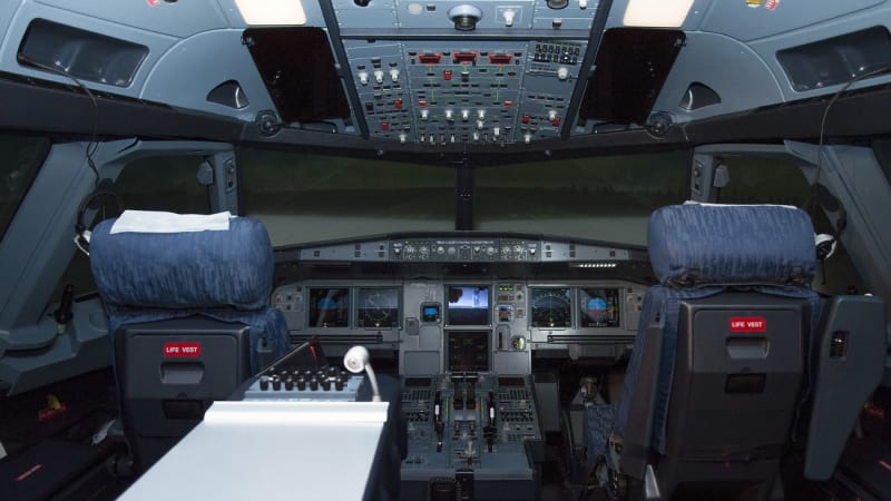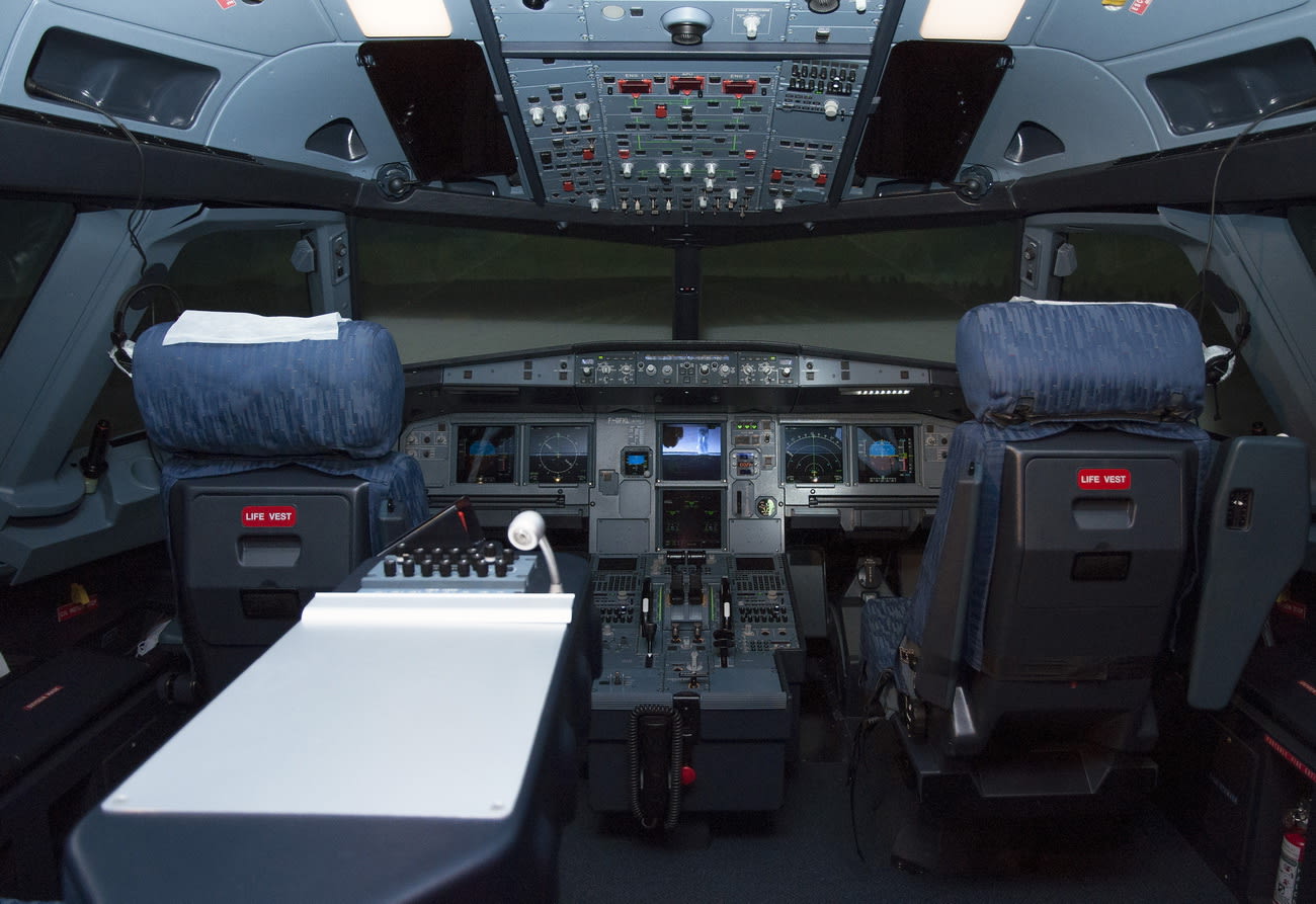 Со стороны полный симулятор полёта выглядит как радар системы противоракетной обороны или футуристическая конструкция из «Космической одиссеи 2001 года», установленная на огромные пневмоцилиндры с шарнирами. Сами лётчики, кстати, ласково называют прибор «кастрюлей». Но если снаружи тренажёр не напоминает самолёт даже отдалённо, то внутри ты видишь самую настоящую кабину авиалайнера Airbus A320: те же кресла, та же панель приборов и центральный пульт со всеми рычагами, сайдстики – боковые рукоятки управления для командира воздушного судна и второго пилота.