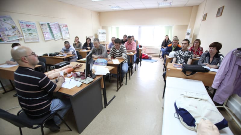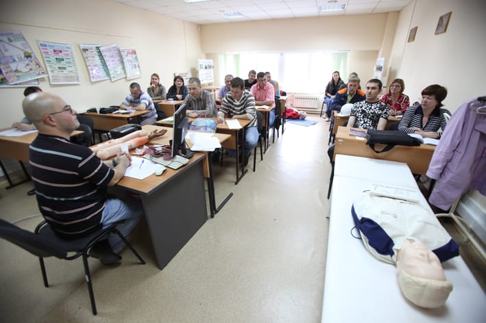 «Обнаружен пострадавший. В области стопы обильное кровотечение, из раны алая кровь бьёт фонтаном. Что будете делать?» Аудитория учебного центра ОАО «Иркутскэнерго», обычное занятие по охране труда. В кабинете – 20 энергетиков, работников различных филиалов компании. На столе перед преподавателем лежит правдоподобный макет руки, на которую никто из присутствующих уже не обращает внимания: как оказывать первую медицинскую помощь при травмах рук, уже разобрали, теперь перешли к другим повреждениям. В аудитории буквально каждый метр используется с максимальной пользой: на стенах – информационные стенды, в углу – манекен Гоша, которого совсем недавно пытались реанимировать.