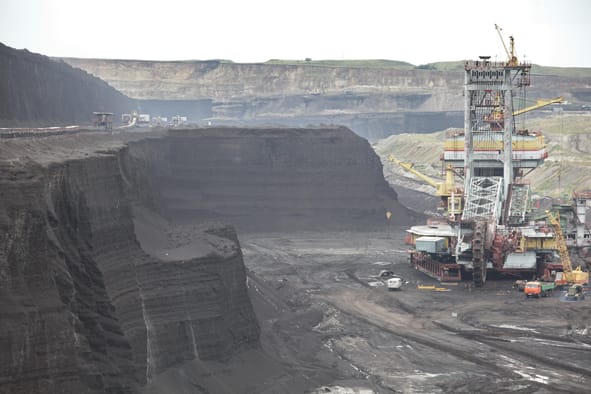 Здесь не менее величественное творение дел человеческих, чем на Бородинском: чёрной жирной полосой Назаровский подчёркивает горизонт. Но простая геометрическая форма скрывает сложные геологические особенности. «Неустойчивые породы, обводнённость», – заместитель исполнительного директора по производству Александр Зиновьев рассказывает о том, с чем приходится бороться при добыче.