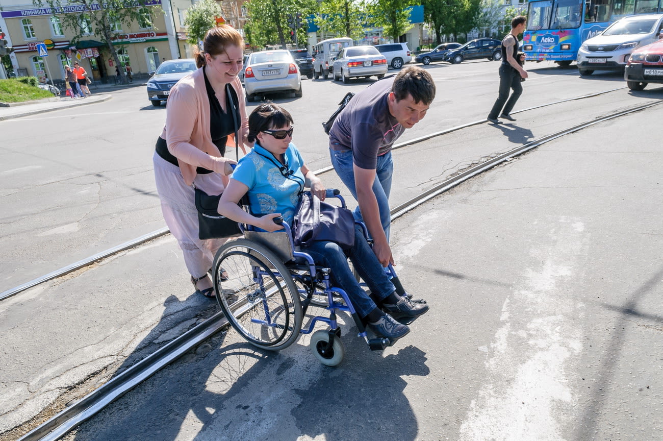 Например, в ходе своего эксперимента на трамвайных путях, на неровной дороге перекрёстка Ленина и Тимирязева мы неловко въехали в чьи-то ноги. Их обладательницей оказалась сварливая женщина. Воплем «Разъездились тут…» она сообщила нам, что в её понимании дороги, улицы, трамваи и весь этот прекрасный, цветущий летний мир – не для тех, у кого ног, по сути, нет. За время нашей неторопливой прогулки лишь один человек помог – когда тяжёлая коляска застряла на трамвайных путях. Загорался красный свет, машины назойливо гудели, трамвай трогался, но колесо упорно не выскакивало из колдобины, внутри же что-то обмирало от ужаса. Какой-то мужчина бросился на помощь, приподнял колёса, выкатил коляску на более ровную поверхность, помог доехать до тротуара и взобраться на него.