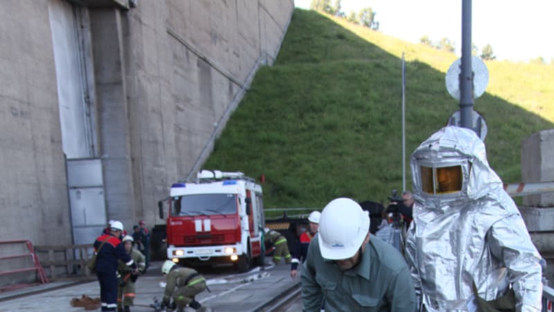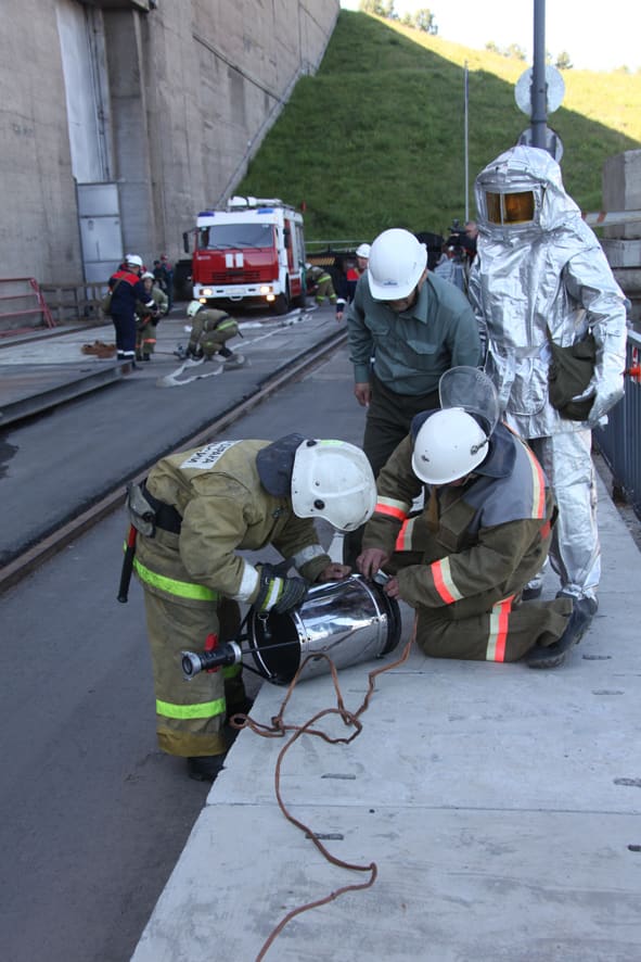 И вот первая тревога. По рации поступил сигнал, что загорелся трансформатор мощностью 80 тыс. киловольт-ампер. По легенде, не сработала автоматическая система пожаротушения, поэтому справляться персоналу ГЭС с огнем придётся самостоятельно. Пока на станцию едет пожарная автомашина, внештатное аварийно-спасательное формирование проводит работы по заземлению. «Наша функция – заземлить, сделать возможным проезд пожарной машины на территорию, обеспечить пожарных средствами индивидуальной защиты – диэлектрическими ботами и перчатками. После того как оборудование отключено и заземлено, оперативный персонал допускает пожарных на тушение возгорания. Практически должна сработать стационарная система пожаротушения, но мы заложили в сценарий наиболее тяжёлый вариант развития событий», – пояснил заместитель главного инженера по эксплуатации, на учениях командир сводно-спасательной группы Александр Николаев.