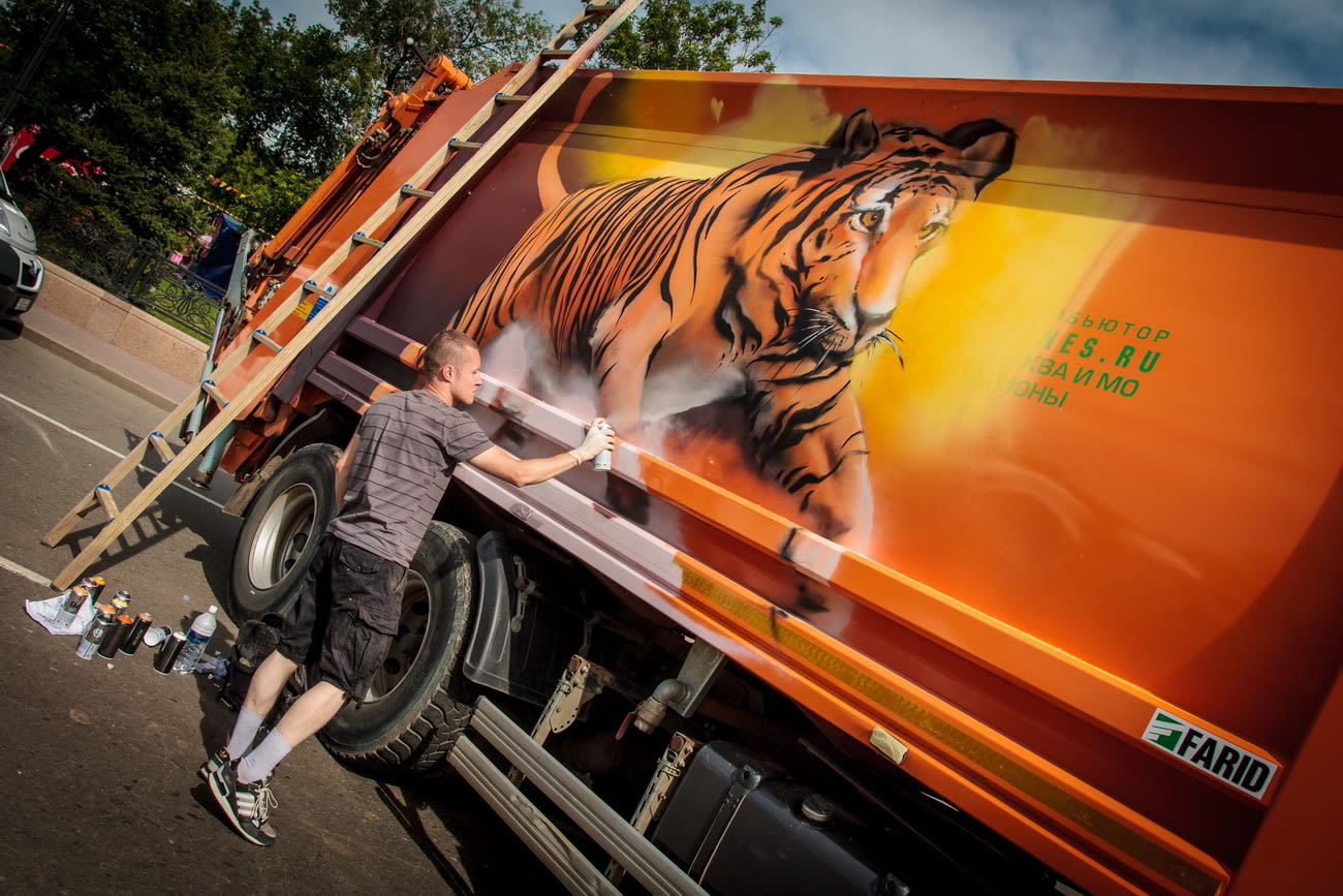 После нескольких часов работы на одном автомобиле появился тигр. Изображение хищника выглядит настолько натурально, что его можно принять за фотографию. На другой стороне кузова этой же машины разместили осьминога. Он больше похож на сказочного героя. Граффити выполняли разные художники, поэтому заметно серьёзное расхождение в стилях рисунков. Ещё один автомобиль украсили изображением космического пространства и абстрактным рисунком бегущего табуна лошадей.