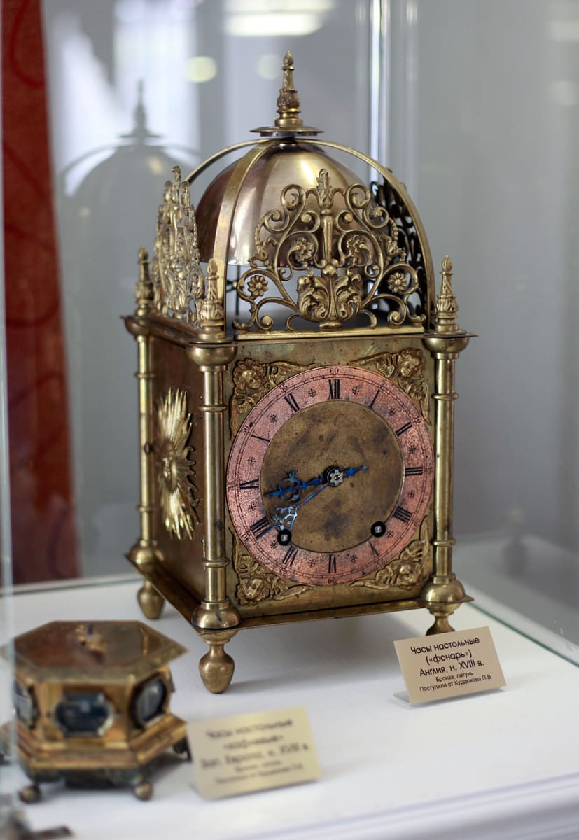 При поступлении часы имели лишь одну часовую стрелку. Возможно, когда-то была и вторая. «Первые экземпляры таких часов, начала 17 века, действительно были с одной стрелкой, позже часы стали делать и с минутной стрелкой», – говорит Нина Крылова. Более того, в литературе описаны факты, как в 18 веке мастера переделывали старые люцерновые часы, добавляя им вторую стрелку. Нина Крылова показывает снимки похожих фонарных часов из богатой частной коллекции Ландрока (Германия). «В коллекции Ландрока хранятся ещё более ранние часы, чем те, что экспонируются в нашем музее. Часы 17-18 веков были не только прибором, показывающим время, но и образцом декоративно-прикладного искусства, предметом роскоши. В период строительства Санкт-Петербурга Пётр I приглашал многих иностранных специалистов, среди них были и англичане. Можно предположить, что часы могли быть завезены в то время. А может, они попали в Россию значительно позже. Сейчас очень трудно определить, когда и как они пересекли границы нашей страны. Но в итоге эти уникальные часы оказались в семье Марии Рикман».