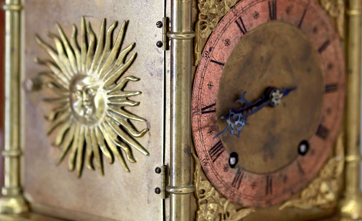 Массивные бронзовые часы, отливающие золотом, с боковыми накладками с изображением солярного символа, стоят в отдельной витрине. Они до сих пор идут, несмотря на то что более старого экспоната в Ангарском музее часов просто нет. Коллекция часов 18 века насчитывает 15 экспонатов, есть и каминные часы европейских мастеров Вильфарта, Хольмейера, Зауэра, Нортона и Твейса. Но время производства этого артефакта всё равно чуть более раннее – конец 17 – начало 18 века. Они относятся к так называемым «люцерновым» часам, которые получили распространение в Англии в 17 веке. «В то время настольные часы были достаточной редкостью, – рассказывает директор Ангарского музея часов Нина Крылова. – Бронзу и латунь использовали для изготовления не только деталей механизма, но и самих корпусов. Именно поэтому часы были очень тяжёлыми».
