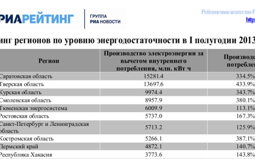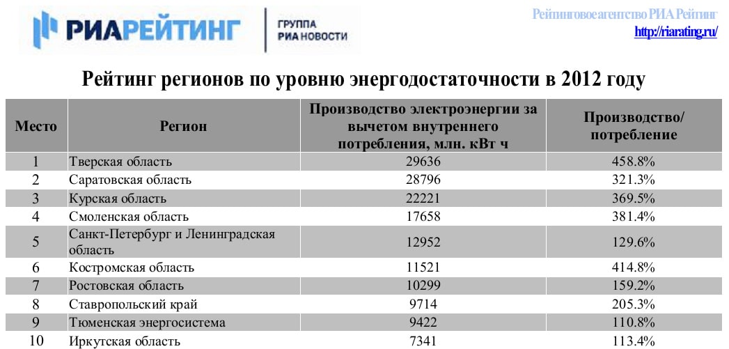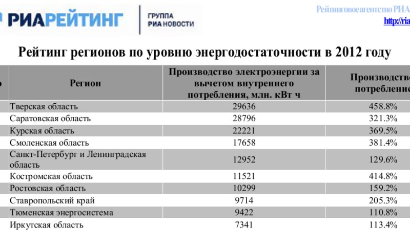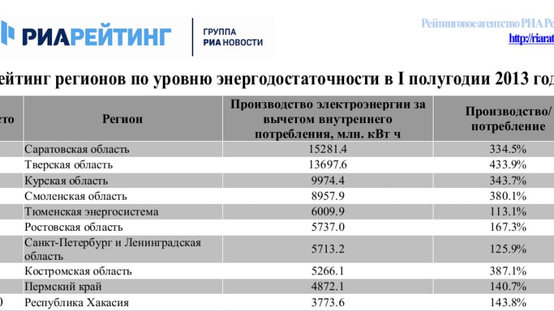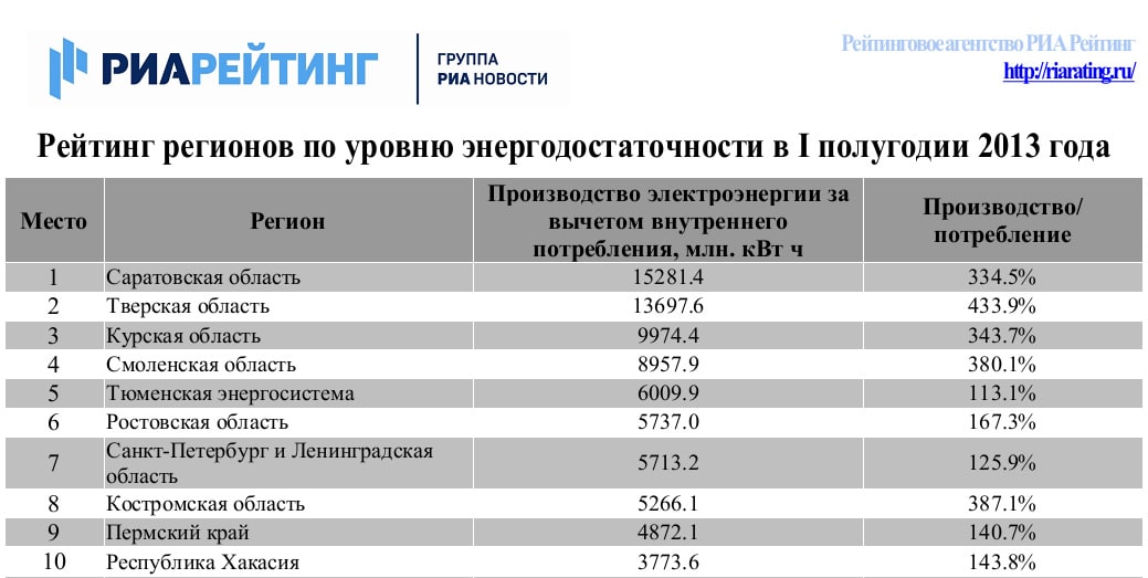 Рейтинг, который составляет агентство из состава медиахолдинга РИА «Новости», характеризует, насколько тот или иной регион обеспечен собственным производством электроэнергии. Ключевым показателем для экспертов при его расчёте является разница между выработкой и потреблением электричества. При этом учитывается и объём генерации за вычетом внутреннего потребления. Так, Тверская область, где было произведено электроэнергии больше чем в 4,3 раза, чем потреблено, заняла лишь второе место после Саратовской области, где эти показатели отличаются в 3,3 раза. Дело в том, что в абсолютных цифрах разница между выработкой и внутренним потреблением в первом регионе составила 13,698 млрд. кВт-ч. А во втором, где за счёт благоприятной гидрологической ситуации на 20% увеличился объём производства электричества на Саратовской ГЭС, – 15,281 млрд. кВт-ч.