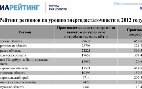 Иркутская область по итогам первого полугодия 2013 года стала 18-й в списке энергодостаточных регионов. Перечень составили эксперты РИА «Рейтинг», исходя из данных Системного оператора Единой энергетической системы России и Федеральной службы государственной статистики. Согласно им выработка электроэнергии в нашем регионе на 4,5% превышает электропотребление. Несмотря на то что дела на первый взгляд обстоят благополучно, по сравнению с 2012 годом Иркутская область опустилась на восемь строк, а в 2017-м в ней может наступить энергодефицит.